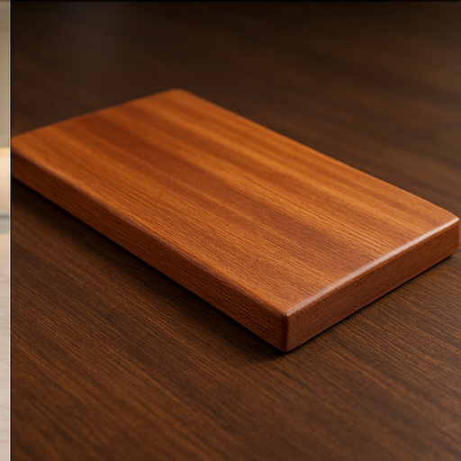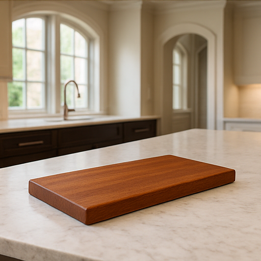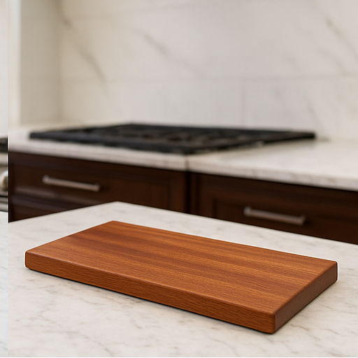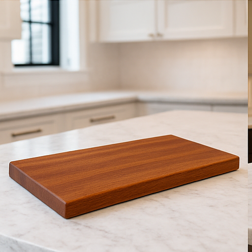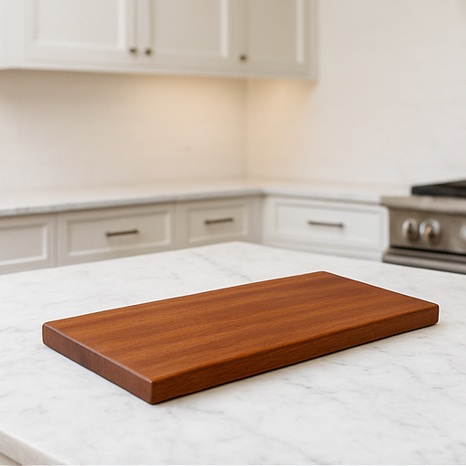 Cut from solid African Mahogany for unmatched durability and beauty. Finished smooth and ready for kitchen use. Size: 11" x 7" x .4"
